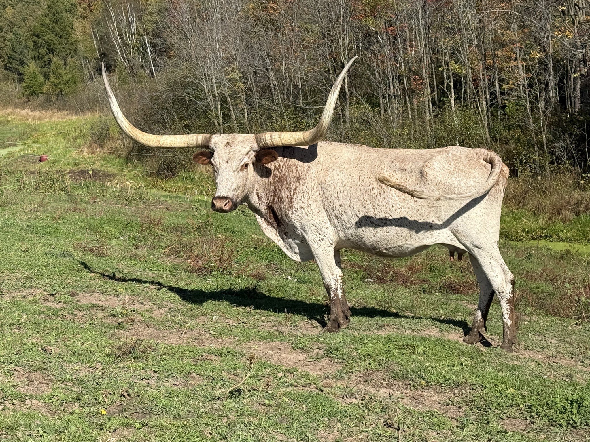 Beautiful daughter of 20 Gauge, crossed with the Wire Grass Laura family. Lilly has a great bag with well placed teats, She is a great milker. Shé raises a big calf. She gave us 2 heifers back to back and then a bull calf. Lilly has a calf every year. She has a ton of total horn, easy disposition and is child friendly. She is in the pasture with Top Saddle.